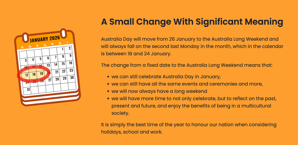 Australia Long Weekend could be a great positive step forward, even if just an interim measure. Avoiding the actual day of 26 January while still ‘celebrating’ around the same time